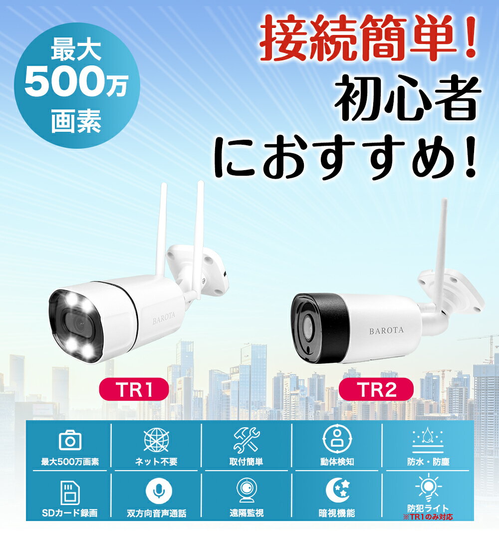 【1500円OFFクーポン&P5倍!】防犯カメラ 屋外 工事不要 ワイヤレス 300/500万画素 家庭用 無線 有線 24時間録画 ネット不要 夜間カラー 監視カメラ ネットワーク 防水 SDカード録画 遠隔監視 動体検知 自宅 業務用 いたずら 防犯対策 車上荒らし【TR1&TR2】